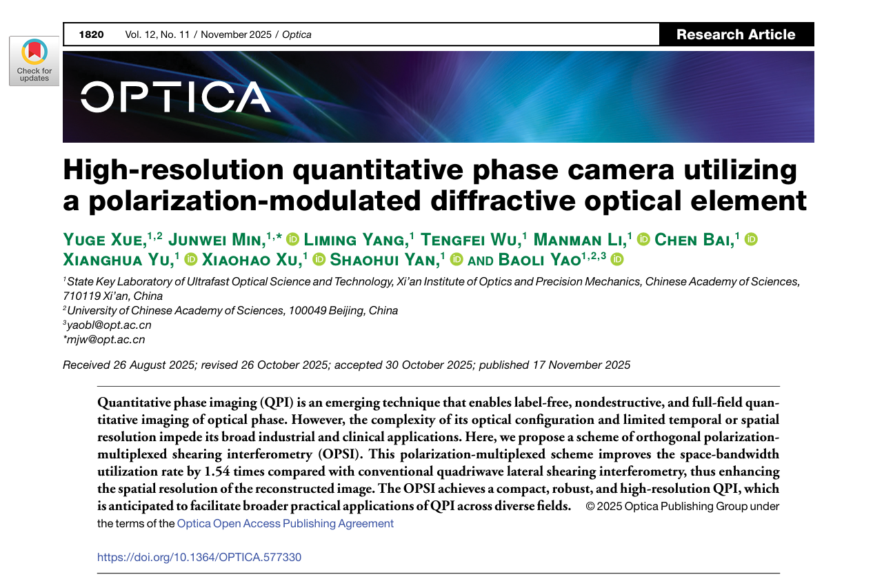 近日,超快光科学与技术全国重点实验室姚保利研究员团队在定量相位成像(Quantitative Phase Imaging, QPI)领域取得了重要进展,相关研究成果发表于光学领域国际著名期刊Optica。论文第一作者为中国科学院西安光机所2022级博士研究生薛雨阁,通讯作者为闵俊伟和姚保利研究员,西安光机所为第一完成单位及通讯单位。