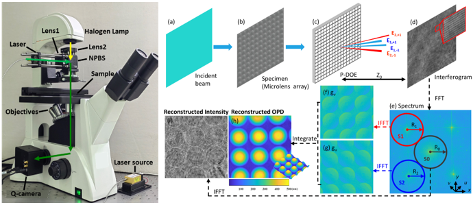 图1. Q-camera用于显微成像的实物装置图以及工作流程示意图