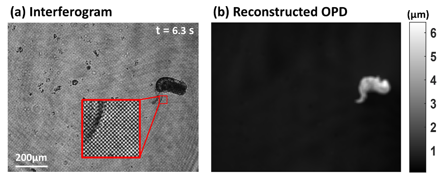 基于上述OPSI方法构建集成化定量相位相机Q-camera,将空间带宽利用率由39%提升至54%,显著增强了系统的成像细节分辨能力。相机支持单次曝光实时成像,实验以30fps的帧频展示了水中轮虫的实时运动行为(如图2所示)。此外,该技术兼容激光与低相干宽带光源,并具有宽波段适用能力,使用宽带照明光源(如卤素灯等)照明可以显著提升图像质量。