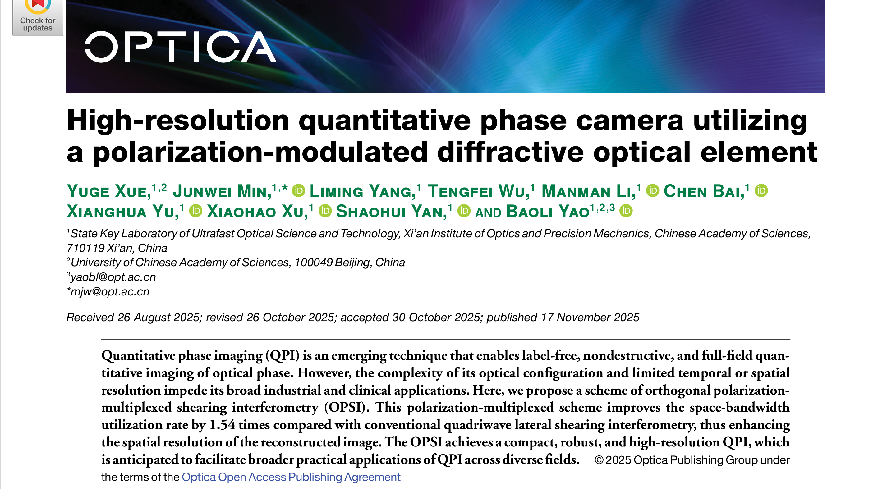 近日,超快光科学与技术全国重点实验室姚保利研究员团队在定量相位成像(Quantitative Phase Imaging, QPI)领域取得了重要进展,相关研究成果发表于光学领域国际著名期刊Optica。论文第一作者为中国科学院西安光...2025-12-01