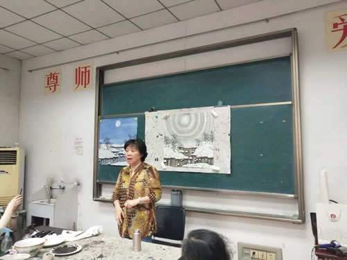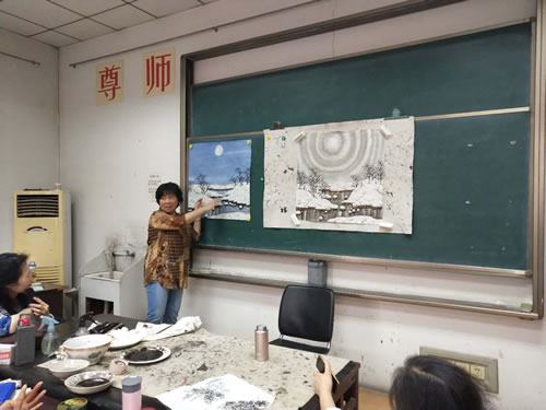 我校工笔画专业每学期原来只有一个班且不到20人,现在增专业且增班级,每班40多人次。此次我校开设冰雪写意山水画专业,顺应了广大学员的愿望和需求,曹靖妮老师也是不负众望,在教学中因势利导,将工笔画与冰雪写意技法紧密结合,编写的教学大纲既通俗又易懂,她还借助网络平台建立了冰雪写意山水画微信群,将每次授课内容录制成视频,发给学员课后自学,使学员受益匪浅,学员们特别喜爱,每节课无一人缺席。