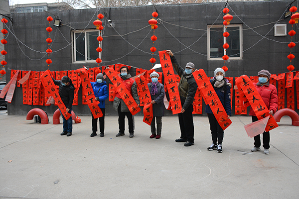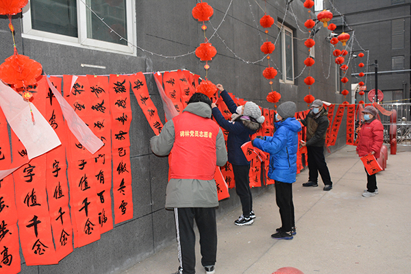 “虎振雄风留浩气,兔迎盛世启新程”“阖家欢乐纳千祥,和顺门第增百福”“一帆风顺年年好,万事如意步步高”----------,书法爱好者们提前写好的对联悬挂起来,墨香味浓浓。200副春联和200张“福”字均包含着相同的美好祝福 。 一副副春联佳作满载着新春的祝福,凝聚美好的憧憬, 让大家感受到了浓浓的“年”味。