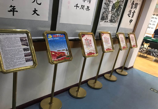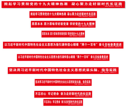 3日下午,离退休党总支组织人员在生活区南北两院张贴了宣传横幅。“掀起学习贯彻党的十九大精神热潮 凝心聚力走好新时代长征路” 、“原原本本 原汁原味学好新党章 学好党的十九大精神”、“以习近平新时代中国特色社会主义思想为指引 满怀信心朝着两个一百年奋斗目标奋勇前进”、“坚决用习近平新时代中国特色社会主义思想武装头脑、指导实践”、“不忘初心,牢记使命,奋力走好新时代的长征路”等十多条主题鲜明、位置醒目的大红标语在院落纷纷呈现,营造了学习宣传贯彻党的十九大报告精神的热烈氛围。与此同时,学习宣传贯彻党的十九大报告精神专题展板、海报、联展、LED显示屏等平台也联袂宣传了相应内容。