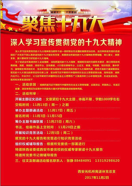 离退休党总支还已发出书面通知,近期陆续将开展学习宣传贯彻党的十九大报告精神专题征文、朗诵、书画展、知识竞赛、特邀报告等一系列主题党日活动,把各方面的力量凝聚到实现党的十九大提出的各项目标任务上来,坚决用习近平新时代中国特色社会主义思想武装头脑、指导实践,做到内化于心、外化于行,让习近平新时代中国特色社会主义思想在广大离退休职工心中落地生根,形成生动实践。 (西安光机所离退休党总支张静 供稿)