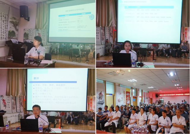 首先,陕西省友谊医院医联体办公室主任王霞为大家做题为《2019年度光机所离退人员健康体检结果汇总分析报告》,介绍了本次体检的基本情况、体检要素、主要异常结果数据统计及分析。随后,医院神经内科主任郭桂智做题为《颈部斑块的防治和TCD数据分析》的报告,主要讲述了颈部动脉斑块形成的原因、过程、危险因素、导致脑卒中的危害、注意事项、防治措施等,还就超声经颅多普勒(TCD)的简要原理、检查结论的意义做简要说明。第三,医院呼吸消化内科主任雷锐利为大家讲解肺部异常影像及血脂异常,讲述了肺部结节、肺大泡、肺间质纤维化、胸膜肥厚、粘连、纤维条索影、钙化影的意义,通常检测的血脂六项、《中国成人血脂异常防治指南》中血脂异常的4种类型、血脂异常引起的疾病及防治等做了进一步阐述。第四,医院内分泌康复科主任边芳做《糖尿病及甲状腺科普》知识讲座,从糖尿病相关检测项目意义、甲状腺功能检测指标的意义、甲状腺结节的意义三个方面讲述了糖尿病、甲亢、甲减、甲状腺结节的基本知识、防护措施和注意事项。第五,医院检验科主管检验师郭洁主要讲解了肿瘤五项和七项所含项目的内容和意义,解读新技术对肿瘤筛查发挥的重要作用。最后,医院肿瘤科主任张靖伟对体检报告中B超、肿瘤标志物的异常结果进行解读,对肝肾等器官囊肿、血管瘤、脂肪肝、胆囊息肉、胆囊结石、前列腺增生等疾病的基本知识和检查方法做综合介绍,对肿瘤标志物检测做了基本介绍,一般不单独作为肿瘤诊断依据,健康人轻度增高不能认为患有肿瘤,会有多种影响因素,可一月后复查,还要结合临床症状、影像学结果。