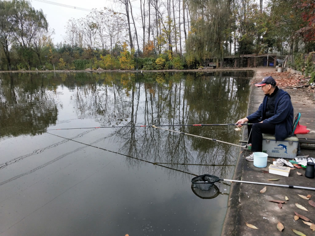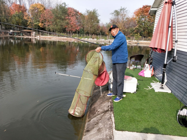 垂钓场周围,皆为树木,除了少许落叶,绿草茵茵。草丛间满,种有蔬菜。微风清新,水面涟漪微现。偶有一些小鸟,如鸽子大小,或形似山雀,散落树间,或菜地,东躲西藏,有时会发出清脆鸣唱,仿佛在捉迷藏。两个鱼池中间,有一米见宽的过桥,连接两个鱼池,桥面铺垫软塑料毯,行在其中,舒适柔软。虽入深秋,却没有枯藤老树昏鸦的颓然,相反,景致非常养眼,树间不仅绿叶依然,还有黄叶、红叶相伴,宛如一幅精致的山水画。置身其中,令人心旷神怡,流连忘返。油然想起李白“白云深处有人家”和杜牧“ 霜叶红于二月花”诗句,如此联想,深感中国文化的优美韵味与博大精深,接地气。