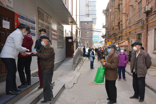 3月18日上午,离退休党总支书记、离退办主任李广路,离退休党总支副书记高薛燕,离退休七个支部书记陈中仁、王拥祠、王萍、解兴惠、张瑛、贺建安、李志刚,以及总支和支部委员张晓春、李建园、张静、刘永成、海孝永、刘小玲、贾兰等同志在研究所友谊路园区北生活区,现场维持秩序,测量体温,组织大家依次排队。离退休老同志们自觉接受体温检测,间隔一米距离,有序行进,领取防控物质。