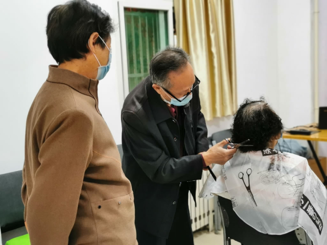 离退休职工活动中心的多功能室稍加改造,几把椅子并排,桌子间隔放开,一个简易的理发室应运而生。所老年志愿者协会成员按照疫情防控要求,全程佩戴口罩,进行体温监测,对双手及理发工具进行卫生消杀,以防交叉感染。前来理发的老同志秩序井然的在外分散等候,随剪随走,人员很少聚集。老年志愿者协会会长海孝永、副会长张帮录,亲自操剪,他俩轻车熟路地给老同志们围上围布,拿起梳子,挥舞剪刀,使用电推,他俩技艺精湛、动作娴熟,现场人员均佩戴口罩,或低头,或抬头,紧密配合着理发师的动作。通过理发师的巧手妙剪,老同志们个个精神焕发,神采奕奕。他们感激地说,“爱心理发确实为我们解决了大问题,感谢志愿者们,真心为他们点赞。”