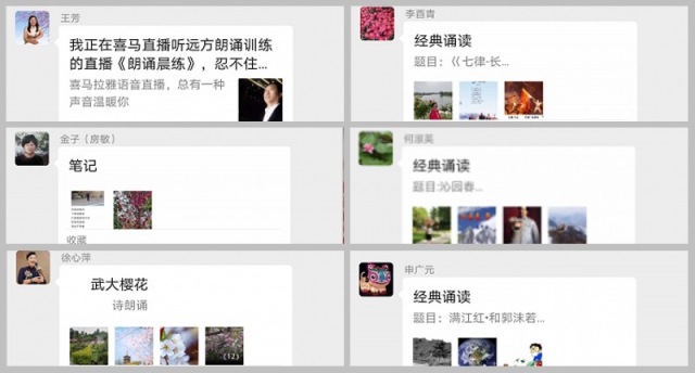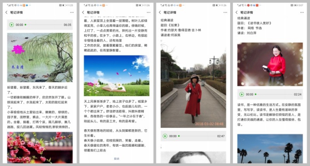 活动中诵读的有中华美文、名家名篇、经典诗词等多种篇目,诵读的作品体裁不拘一格,形式多样。诵读主题鲜明,内容积极向上,传递了满满的正能量。约30名诵读爱好者诵读的作品中既有歌颂祖国的文章《必胜》《谁是最可爱的人》《英雄》,又有经典诗词《沁园春·雪》《卜算子·咏梅》《七律·长征》,还有自创作品《情怀三镇》《抗冠魔》《战疫情》,这些作品从多个视角展现了中华文化的深厚底蕴。诵友们虽然没有见面,但都用智能手机编辑成图文并茂的美篇、笔记收藏、PPT,辅助配以图片、文字、视频、MP3等方式在微信群、QQ群巡回展示。他(她)们或独诵,或夫妻合诵,或祖孙同诵,用清晰的语言,优美的声音,把原诗歌、作品有感情地向听众们表达出来,传达出诗歌的思想内容,引起了诵友们和听众的情感共震,思想共鸣。