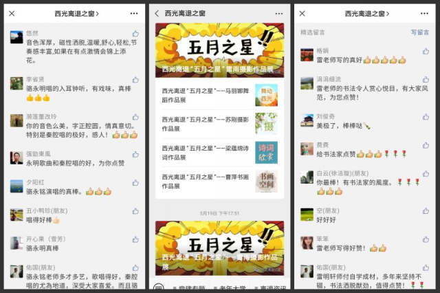 据不完全统计,本次活动先后共展出各类作品816幅,在微信公众平台分11批次,以“诗词欣赏”“书画空间”“美食天地”“舞动西光”“唱响西光”“手工天地”“摄影时间”等几个板块展出,浏览数累计达到10671人次。活动期间,西光离退休各微信群、老同志朋友圈内、公众号留言区“星光灿烂”的点赞声和叫好声络绎不绝,热闹非凡。根据人气数排名情况,最后评选出了5位“五月之星”,他们分别是雷雨、李佑国、吴金枝、耿永、赵丽珍,还评选出了5位单项之星,他们是“诗词之星”徐心平、“摄影之星”周金平、“书画之星”徐洁璇、“厨艺之星”吴宝兰、“舞蹈之星”张连茹、“歌咏之星”骆永明。