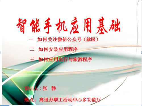 今年年初至7月中旬,离退办张静同志根据老同志需求陆续制作图文并茂的“智能手机基础培训”PPT,并教授了四期现场培训课程。她从智能手机的基本操作内容开始讲解,逐步过渡到微信等生活和社交实用热门应用程序,以“一步一图”方式对每个操作进行详细讲解,直观的图片演示和详尽的操作指导,让现场接受培训的老同志一看就明白,一听就清楚,学习体验显得非常轻松、高效。