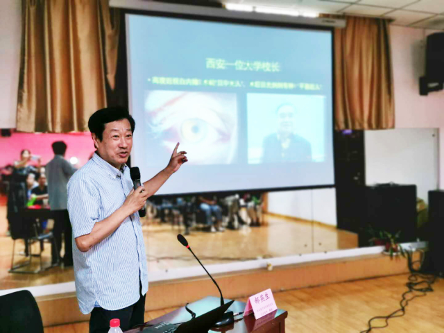 活动于下午2:30正式开始。首先,西安爱尔眼科医院院长、眼科主任医师郝燕生教授为大家作题为《老年眼睛常见病及眼保健》的健康讲座,内容包括常规眼保健和白内障、青光眼、眼底病、孩子近视、干眼病的发病及治疗等。郝教授首先从自己的工作经历讲起,简要介绍了自己一直从事眼科医疗及教学工作的概况以及与西安光机所几任老领导老专家的情感渊源。接着,他讲解了眼睛保健的必要性和重要性、随着年龄增加人眼的屈光变化、儿童青少年和中青年的眼保健。着重讲述了影响老年人视力的眼病及老年人的眼保健,细致介绍了老年白内障的形成、分类治疗及手术方式,防止偏听偏信导致误诊,现代新技术治疗白内障的优异效果为老同志带来的福音,大大改善了老同志的生活质量。接下来,他讲解了青光眼分型及临床表现和治疗原则、眼底病和干眼病的病因危害及防治。最后,他为老同志提出了五个眼睛保健建议:一是保持平时健康的生活方式,二是健康的用眼方式,三是尊重医生的指导,四是经常做眼科检查,五是预防为主小病早治。郝院长祝愿老同志们保护好自己的眼睛,活出高质量的老年生活。整场报告通俗易懂,具有较强的实用指导价值,大家普遍感到受益匪浅。