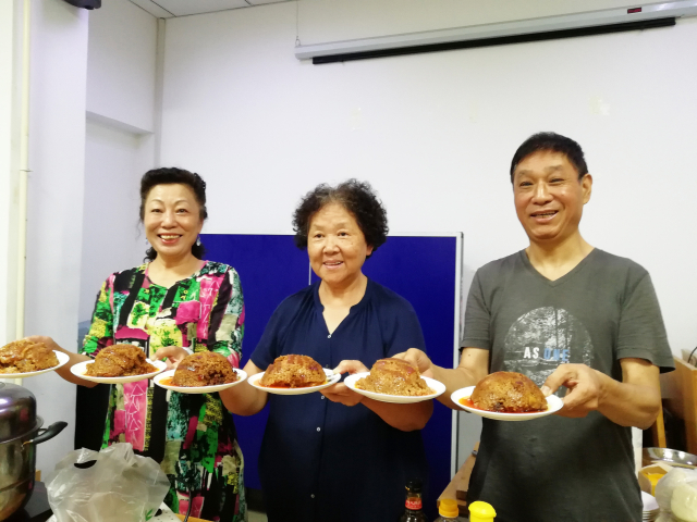 粉蒸肉作为中国美食的一道经典菜品,其久负盛名并深受欢迎就在于它把中国饮食文化的精髓通过烹饪的技法精彩而完美地展现给人们,五花肉和大米的巧妙结合再经几种调料和酱料的入味,最后经高温蒸制使菜品得以质的升华,看似普通的食材也没有过多修饰的一道菜品却能给食客带来肉酥味浓,米粉香糯,油而不腻,百吃不厌的感觉,成为男女老幼都能接受和喜爱的一道美食。而这道家喻户晓的美味佳肴究竟该如何烹制,特别是怎样在家庭也能做出饭店粉蒸肉的味道,专业大厨给出的秘诀就是重点要围绕怎样让肉品入味做好文章,而这其中的关键就是一定要炒制好香味浓郁的粉蒸肉酱料,许多人蒸制的粉蒸肉寡淡无味主要原因就是这一步骤的操作不到位。为了原汁原味地借鉴和吸收专业大厨制作粉蒸肉的方法和经验,参加厨艺实践活动的三位会员在反复观看大厨制作粉蒸肉教学视频的基础上,打响了制作粉蒸肉的攻坚战,由于制作粉蒸肉辅料的数量较少无法分别使用,因而采取了两步走的方法,粉蒸肉酱料集中炒制,其余的烹饪工序各自在家中完成。18日下午,三位会员首先启动酱料炒制程序,六种调料和四种酱料在热油的激发下香气瞬间弥漫在空气中,尽管操作室关着门,但挡不住闻香而来的许多老同志,纷纷询问什么东西这么香,在得知仅是酱料的香味后一些老同志说这样做的粉蒸肉一定会很好吃。随后三位会员按照专业的烹饪方法各自在家中先后对主材大肉进行清洗、烫皮、切片,以及进行调料拌制、分装上碗和大火蒸制等步骤,为了保证第二天按期交付厨艺成果,三位会员有的顾不上给家人做晚饭,有的一直蒸制到凌晨2点,虽然十分辛劳,但当一碗碗色泽红亮满屋飘香的粉蒸肉呈现在他们眼前时,所有的疲劳感瞬间被成功者的喜悦所代替。