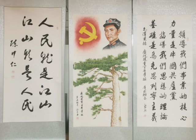 此次展览共组织书画作品近百件,经过认真品评,最终遴选、装裱,并向大众集中展览了57件优秀作品,这些展览的作品主题鲜明、内容丰富、形式多样,既有笔法流畅、书艺老成之作,也有推陈出新、独具风格之作;既有取材于党的发展历程的恢宏史书,也有选题于红色历史的身边故事,不仅体现了书法绘画的艺术性,更体现了敬党、爱国、拥护共产党的政治性,表现出书画艺术浓厚的文化底蕴和独特的艺术魅力。