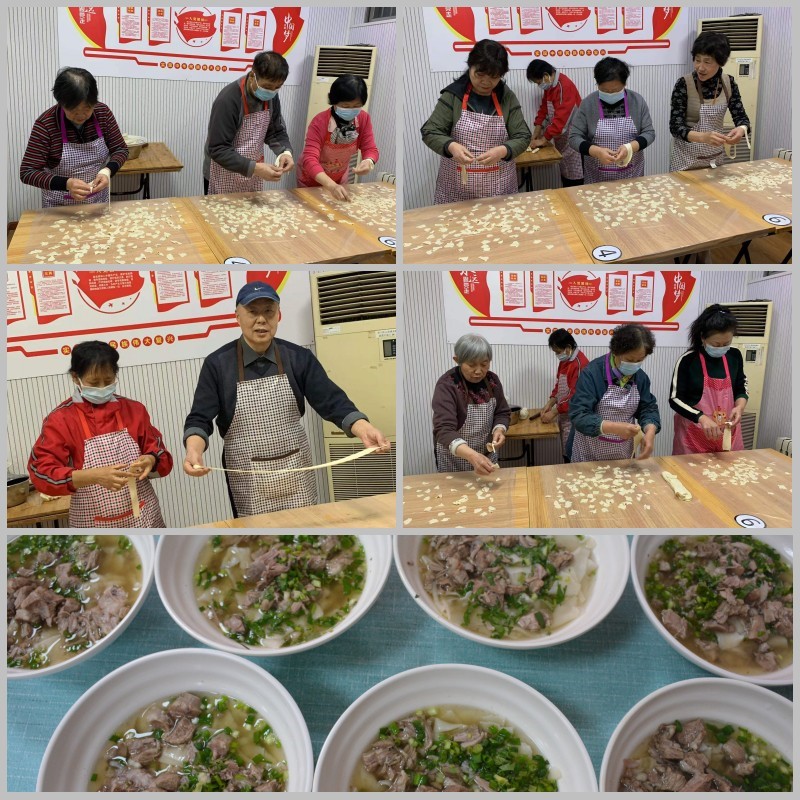 为了充分表达厨艺人的一片爱心并积极配合党总支圆满完成此次冬日送温暖活动的任务,协会全体会员以饱满的热情和高昂的斗志投入到活动之中,力争把制作美食的任务做到极致,大家提前一天就启动了前期的烹饪工序流程,为了使面片筋道光滑同时又考虑到老年人的胃口差,面团在反复揉搓的基础上揪片的厚度尽量薄一些以利于消化,同时还备份了西红柿炒鸡蛋及素臊子等配菜,考虑到揪片面的单一性此次还特别为老同志们又增加了炸油饼和葱油大饼两道小吃。