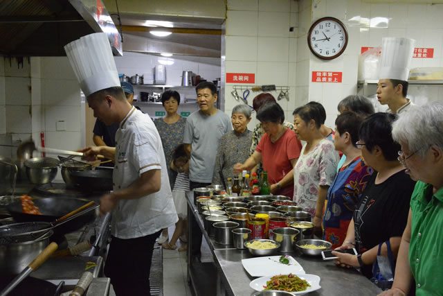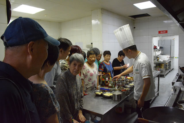 会上,陆经理和朱厨师长分别就家常菜肴的炒、爆、熘、炸、烹作了简要说明,让做出的菜品色泽诱人、形态美观、滋味可口,色香味俱全。他们强调,家庭做菜不同于饭店,配料未必俱全,如果环节稍加变通,同样可取得好的效果。他们以宫保鸡丁和青椒炒肉丝为例,详细介绍了主料、辅料的前期腌制准备,介绍了在烹饪过程中需注意的技巧,包括材料的处理、火候的掌握、油温的判断、调料的选用、挂糊的方法等。通过介绍,激发了与会者浓厚的热情,大家兴趣盎然,纷纷咨询。经过陆经理和朱厨师长热心答疑,耐心解释,大家疑云顿失,受益匪浅。会后,朱厨师长利用餐厅空闲时间,亲手操刀,在餐厅为大家做了非常专业的精彩示范。