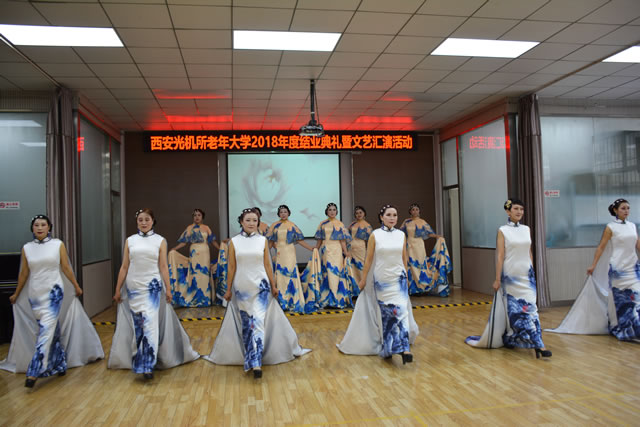 最后,西安光机所老年大学自编自导自演的精彩文艺汇报演出隆重鸣锣,首先一支热情洋溢的舞蹈《我爱你 中国》拉开了演出的序幕,随后,朗诵、合唱、民族舞、肚皮舞、伦巴舞、新疆舞、秦腔演唱、二胡合奏、模特表演、太极拳展示、手风琴齐奏等15个节目盛装登台,联袂展现,地域特色舞《 他大舅他二舅都是他舅》、民族风情新疆舞《一带一路歌》、悠扬动听的手风琴《梁祝》、婉转缠绵的葫芦丝《唱山歌》《映山红》、陕西特色秦腔《祝福》、声情并茂的配乐朗诵《诗意中国》、赏心悦耳的合唱《雁南飞》《茉莉花》《今夜月亮》、端庄典雅的旗袍秀《水墨丹青》、潇洒明快的伦巴《爱相随》等节目精彩纷呈,博得了场下观众的阵阵掌声。莫道桑榆晚,为霞尚满天。西安光机所老年大学学员们用超凡的艺术水准、高昂的奋进姿态、进取的精神面貌向全体与会人员诠释了幸福快乐富足的晚年生活体验,汇报演出在一片祥和的气氛中落下帷幕,学校2018年度结业典礼暨文艺汇演活动取得了圆满成功。(西安光机所老年大学 张静供稿)