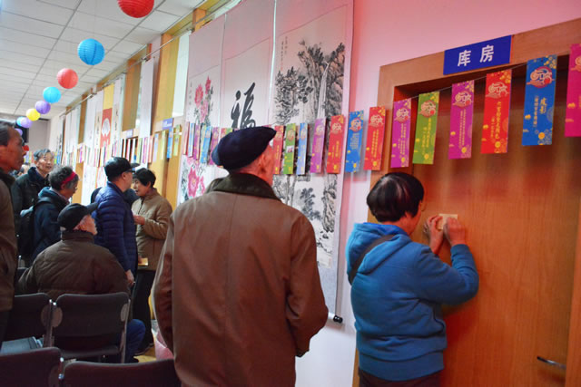 影片结束后大家迫不及待地猜起灯谜。一时间,老同志们你一言我一语,在“灯谜链”中穿梭着。整个大厅在七彩灯笼的映衬下显得格外热闹喜庆,猜中答案的老同志喜出望外地拿着谜面去兑换奖品。还有的老同志双眉紧锁,绞尽脑汁地思考谜底;活动现场充满了欢声笑语,一个小时不到,“灯谜链”上的灯谜便被大家一一猜中,整个活动现场充满了欢乐、喜庆,洋溢着浓厚的节日气氛。