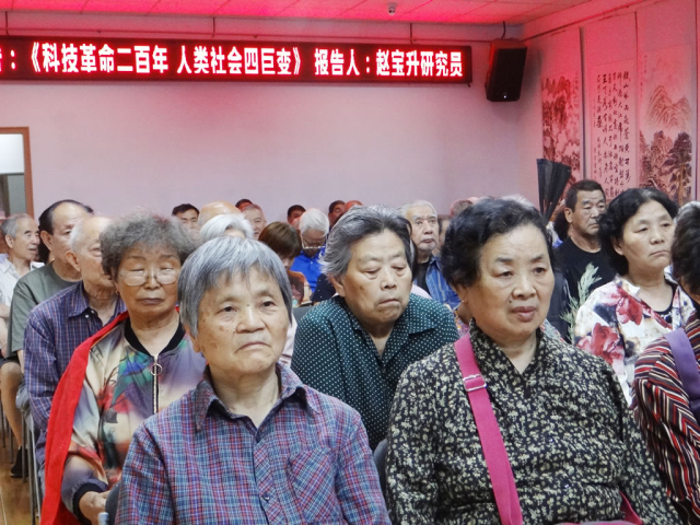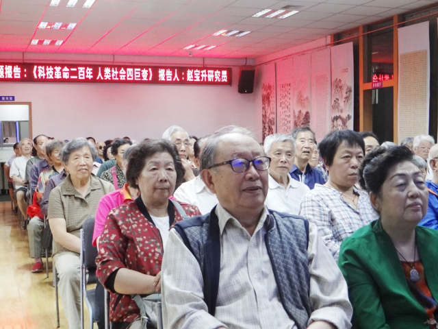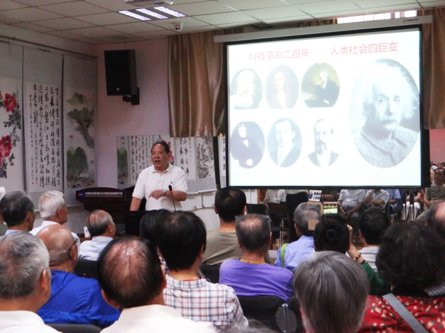 赵宝升研究员用90分钟时间,从哥白尼、伽利略、笛卡尔讲到牛顿、瓦特,从法拉第、安培、伏特、欧姆讲到马可尼、诺贝尔、爱迪生、特斯拉,从爱因斯坦、奥本海默讲到洛克菲勒、卡耐基,从美国历史讲到中美贸易战,从世界科技发展变迁,人类社会和生活巨变,又讲到了老年人的生活护理和健康理疗,洋洋洒洒,收放自如,深入浅出,老同志们仿佛走进了一个科普的世界。整场报告中赵宝升研究员旁征博引、娓娓道来,老同志们听的津津有味。赵宝升最后说:中国错过了第一次和第二次工业革命,导致落后挨打,第三次工业革命搭上了末班车,使中国科学技术水平提高到了一定水平,但因发展时间短,还是存有一定差距,相信我们一定会牢牢把握第四次工业革命契机,最终会实现中华民族的伟大复兴。