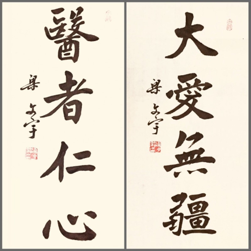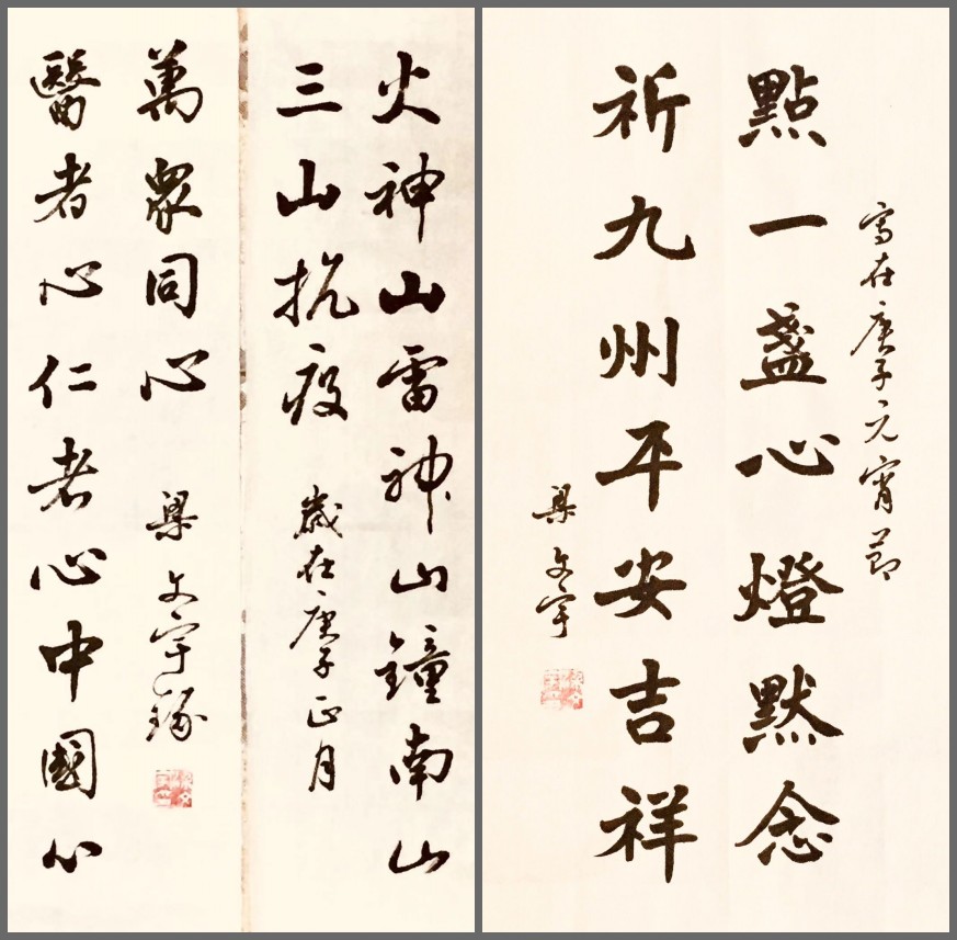 在疫情防控工作的关键时期,梁文宇教授坚持每天创作至少一幅以抗击疫情斗争为主题的书法作品,以图片方式在西安光机所老年大学“快乐书法微信群” 和微信朋友圈巡回展示,时刻宣传和贯彻党中央的决策部署,歌颂白衣战士在抗疫前线的英勇行为,鼓舞广大民众抗击疫情的伟大斗志。梁文宇教授以饱满的创作热情和精湛的书法技艺,创作了上百幅多书体的抗击疫情书法作品。不管是雄浑厚重的大楷,还是端庄秀丽的小楷,古色古香的篆书,还是行云流水的行书,都质朴淡雅,直抒胸臆,他用独特精湛的书豪笔墨,热情颂扬千里驰援的医护人员,热情讴歌英勇抗疫的人民子弟兵,热情歌颂团结奋进的美好新时代,表达了人们“齐心战胜病魔灾难,必将迎来春暖花开”的万丈豪情,更表达了普天民众“点一盏心灯默念,祈九州平安吉祥”的热切期盼。