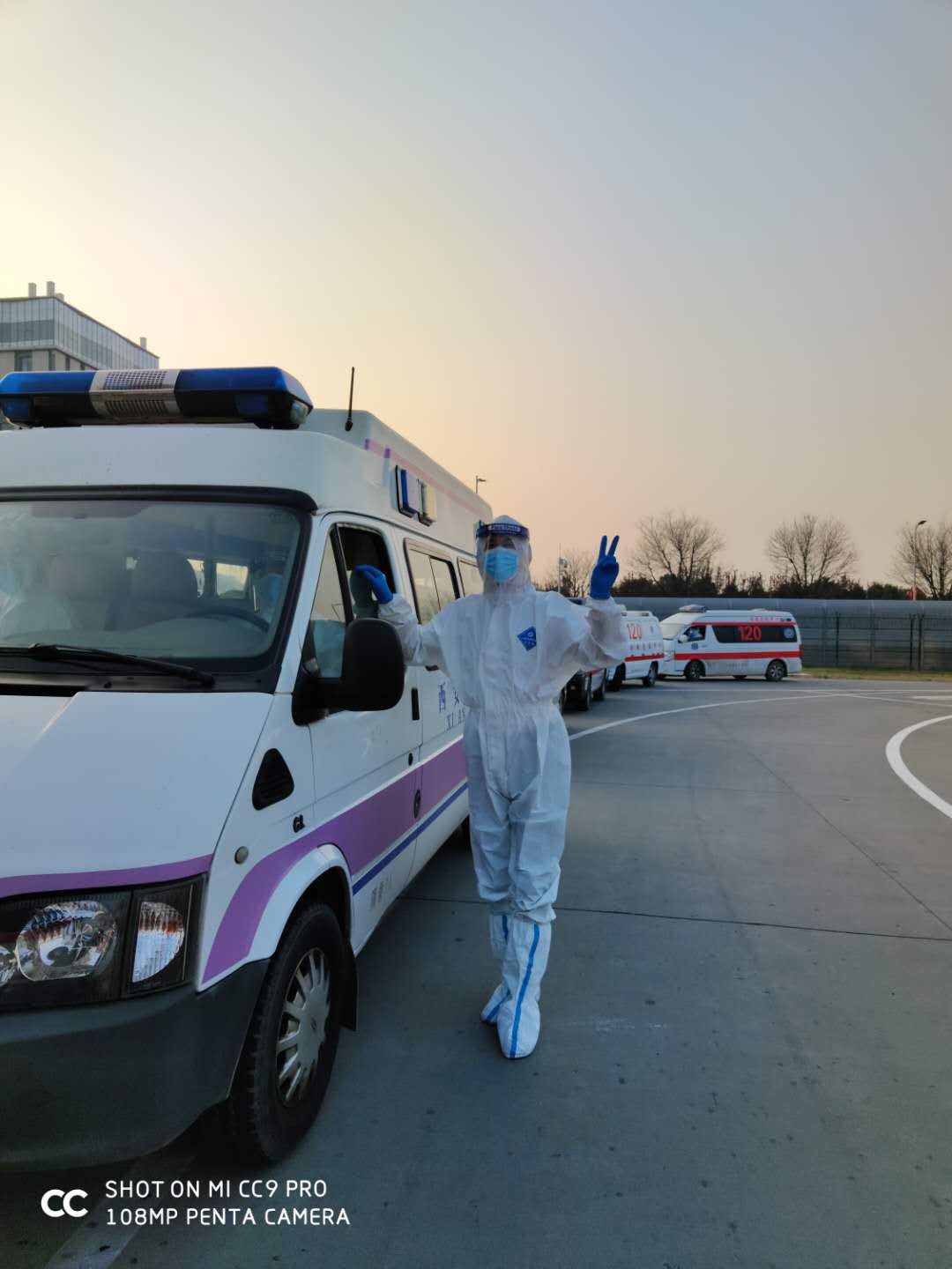 每天早晨,邸新军就开始了一整天的忙碌。因为如厕穿脱防护服实在麻烦,甚至会浪费一身防护服,为此他尽量少喝水,也不敢吃得太多。“这时候的防护服多珍贵啊!”他说。为了让防护服不被污染,每次接送病人后,邸新军与同事们都要用喷壶往彼此的防护服上喷洒消毒水。时值寒冬,穿上被喷湿的防护服,更觉冷上加冷。就算是这样的环境,邸新军和他的队友每天依然乐此不疲的来回奔波。