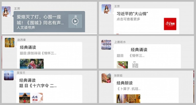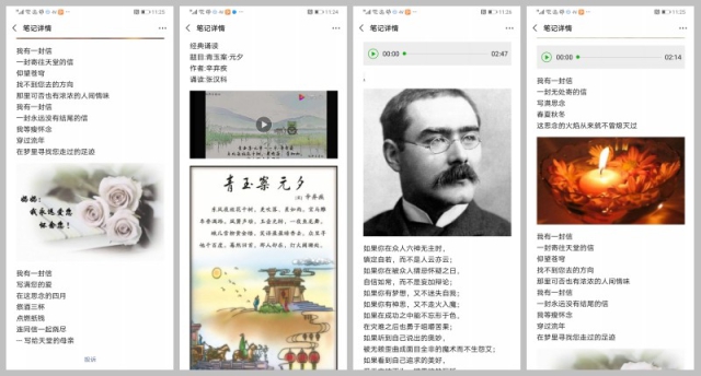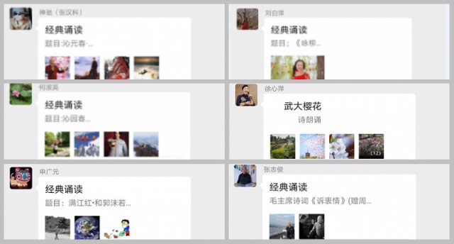 活动中诵读的有中华美文、名家名篇、经典诗词等多种篇目,诵读的作品体裁不拘一格,形式多样。诵读主题鲜明,内容积极向上,传递了满满的正能量。约30名诵读爱好者诵读的作品中既有歌颂祖国的文章《必胜》《谁是最可爱的人》《英雄》,又有经典诗词《沁园春·雪》《卜算子·咏梅》《七律·长征》,还有自创作品《情怀三镇》《抗冠魔》《战疫情》,这些作品从多个视角展现了中华文化的深厚底蕴。诵友们虽然没有见面,但都用智能手机编辑成图文并茂的美篇、笔记收藏、PPT,辅助配以图片、文字、视频、MP3等方式在微信群、QQ群巡回展示。他(她)们或独诵,或夫妻合诵,或祖孙同诵,用清晰的语言,优美的声音,把原诗歌、作品有感情地向听众们表达出来,传达出诗歌的思想内容,引起了诵友们和听众的情感共震,思想共鸣。