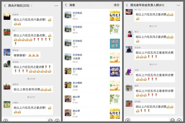 据不完全统计,本次活动先后共展出各类作品816幅,在微信公众平台分11批次,以“诗词欣赏”“书画空间”“美食天地”“舞动西光”“唱响西光”“手工天地”“摄影时间”等几个板块展出,浏览数累计达到10671人次。活动期间,西光离退休各微信群、老同志朋友圈内、公众号留言区“星光灿烂”的点赞声和叫好声络绎不绝,热闹非凡。根据人气数排名情况,最后评选出了5位“五月之星”,他们分别是雷雨、李佑国、吴金枝、耿永、赵丽珍,还评选出了5位单项之星,他们是“诗词之星”徐心平、“摄影之星”周金平、“书画之星”徐洁璇、“厨艺之星”吴宝兰、“舞蹈之星”张连茹、“歌咏之星”骆永明。