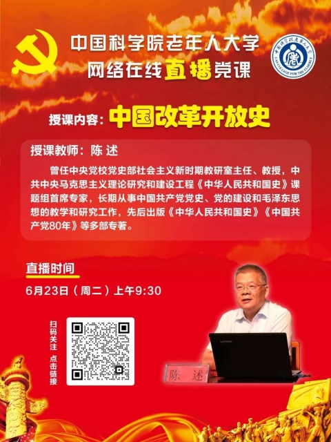 在中国共产党建党99周年即将到来之际,根据中科院离退休干部局统一部署,6月23至24日,离退休党总支组织离退休七个党支部150多名党员,认真直播聆听或回放收听了原中央党校党史部社会主义新时期教研室主任陈述教授,通过网络直播平台所做的《中国改革开放史》在线党课。