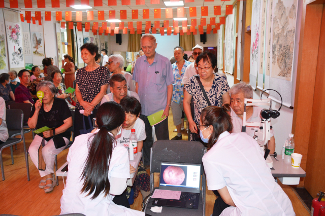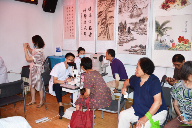 讲座结束之后,进入义诊咨询环节。离退休老同志们根据自身情况,自觉排队接受眼科专家的检查和诊治,免费为大家做眼压、裂隙灯、电脑验光、白内障青光眼常见眼病摸排、糖尿病高血压病人眼底照相等各种眼科检测和检查。有的老同志还带着自己医院检查的报告单,前来寻求专家的诊治与指导,希望对自己眼睛的保健有所帮助。专家们细致询问和检查,耐心解答每位咨询者的问题,为他们分析病情病因、提出治疗方案和防保措施,帮助老同志解除心中疑惑,他们感到非常满意。