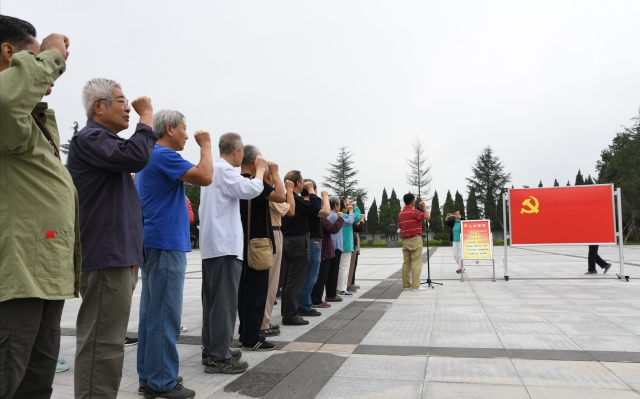 是日清晨,天空中的阴云渐渐的淡了下去,在庄严肃穆的广场中,离退休第六支部党员和部分群众已经列队站在扶眉战役纪念碑下,举行敬献花篮仪式,党支部书记贺建安主持仪式:“同志们!今天,我们来到扶眉战役纪念馆开展党性教育,纪念70多年前发生在我们脚下这片热土上的一场战役,回顾一段浴血荣光的历史,让我们缅怀革命先烈,接受革命传统教育,继承先烈遗志,传承红色基因,不忘初心,牢记使命,忠诚担当,砥砺前行,为实现中华民族伟大复兴的中国梦贡献毕生力量。”第一项奏唱国歌,“起来,不愿做奴隶的人们,把我们的血肉组成我们新的长城……”雄浑的国歌声飘荡在广场的上空;接下来默哀,礼毕后,支部四名党员抬着花篮,在乐曲声中,由广场缓步到中间,然后转向拾阶而上,将花篮置于纪念碑下,整理挽带,鞠躬后缓慢退下,紧接着向扶眉战役革命烈士三鞠躬,然后全体党员在鲜红的党旗下宣誓:“我志愿加入中国共产党,拥护党的纲领,遵守党的章程,履行党员义务,执行党的决定,严守党的纪律,保守党的秘密,对党忠诚,积极工作,为共产主义奋斗终身,随时准备为党和人民牺牲一切,永不叛党。”宣誓人……随后绕纪念碑一周,再进入纪念馆大厅参观。