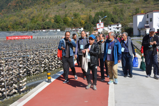 在驻村干部的带领下,老同志们带着疑问和好奇重走了习近平总书记参观考察的路线,沿路大家参观了莲藕种植基地、中药材观赏园、地载木耳种植区、塔载木耳种植区、连栋木耳大棚、培训中心、木耳主题公园、户外休闲体验区等。参观过程中,大家了解了木耳管理技术流程:从原料加工到栽培技术要点,从产品研发到市场销售,从指导农户脱贫再到发展规划。从讲解中还知晓了所谓“两借两还”,就是“借袋还耳”“借棚还耳”,即借给村民菌袋和大棚,还回木耳就行。这样做就是为了打消村民的疑虑,保护农户的积极性,最终促进他们通过自己的劳动增收致富。不仅如此,村上还与农户签订借还协议,由合作社免费向农户提供木耳菌包并进行技术指导,农户打孔、挂袋、采耳、晾晒、交耳。根据“借袋还耳”合同,贫困户通过自己的劳作,换回真金白银,使木耳成为脱贫致富的“金耳朵”,从而走上致富之路。