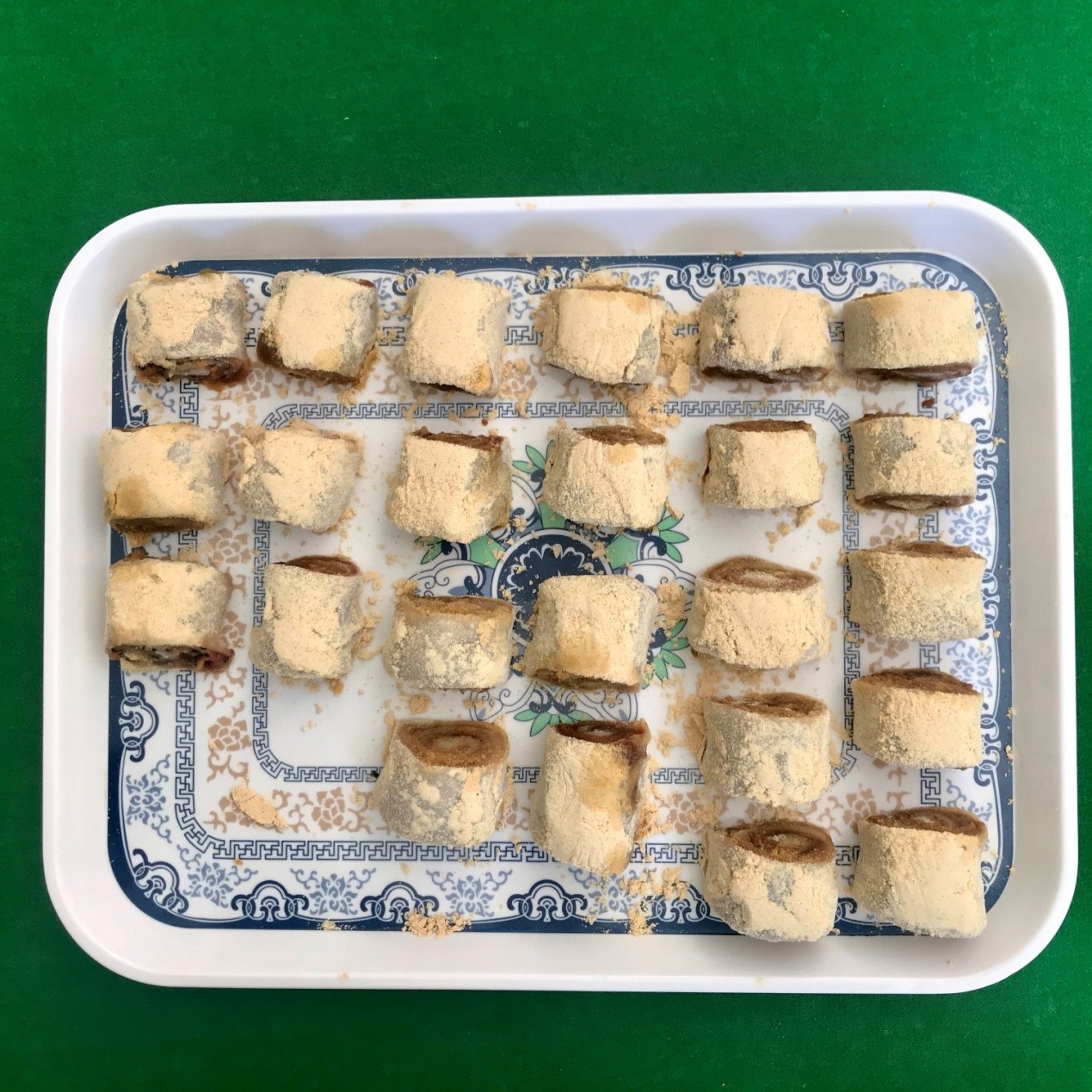 “驴打滚”是我国东北及京津地区具有200多年历史的一道传统名小吃,其也称为“豆面卷子”。制作“驴打滚”的主要原料有糯米粉、豆沙馅、黄豆面等,这道美食因其在最后制作工序中需要撒一些黄豆面,犹如野驴撒欢打滚时扬起的阵阵黄土,故此得名“驴打滚”,其制成品呈现排列有序的红白黄三种色彩,口感细腻绵软,香甜而不腻,是一道别具风味的地方特色小吃。
