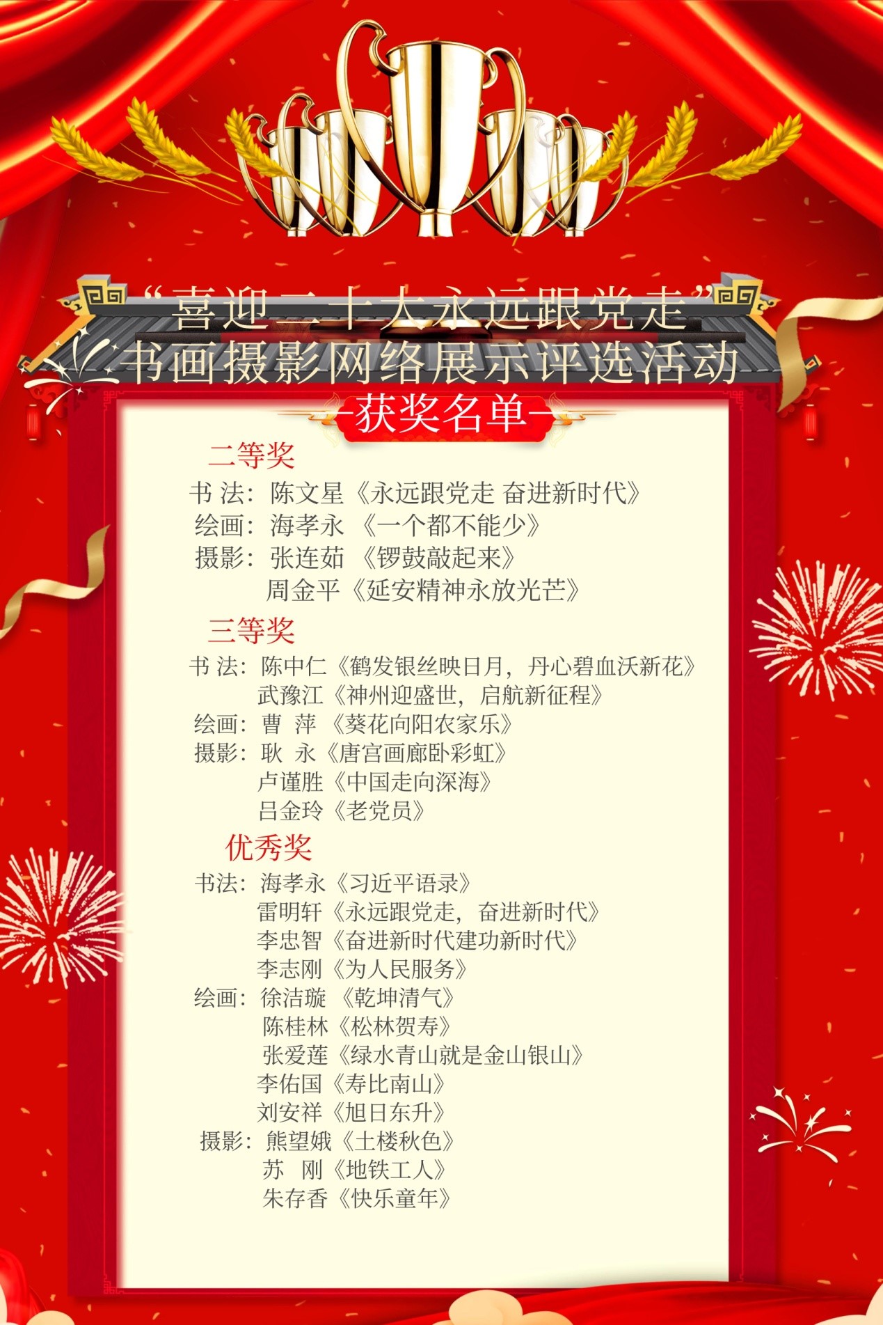 按照分省院开展活动的安排,经网络投票评选,研究所报送的多项作品荣获奖励。荣获二等奖的作品分别是陈文星的书法作品 《永远跟党走 奋进新时代》、海孝永的绘画作品《一个都不能少》、张连茹的摄影作品《锣鼓敲起来》、周金平的摄影作品《延安精神永放光芒》 ;荣获三等奖的作品分别是陈中仁的书法作品《鹤发银丝映日月,丹心碧血沃新花》,武豫江的书法作品《神州迎盛世,启航新征程》,曹萍的绘画作品《葵花向阳农家乐》,耿永的摄影作品《唐宫画廊卧彩虹》,卢谨胜的摄影作品《中国走向深海》,吕金玲摄影作品《老党员》;荣获书画摄影优秀奖的作者有海孝永、雷明轩、李忠智、李志刚、徐洁璇、陈桂林、张爱莲、李佑国、刘安祥、熊望娥、苏刚、朱存香12位同志。