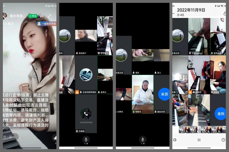 在工作人员热心、耐心手把手的指导下,很多年龄大的教师和学员也很快熟练掌握了线上教学软件,经过几天的反复优化,最终,诗词鉴赏、钢琴、古筝、书画、声乐、舞蹈、手机摄影编辑、手风琴、中阮等十多个专业、六十多个班级的线上课堂,通过不同的直播平台,不同的专业教学设备精彩亮相,真可谓光影浮动,翰墨飘香,以声诉情,指尖挪移,舞姿飞扬,音韵流畅、、、、、