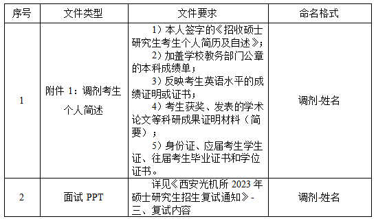 1、获得复试资格的考生需将以下2个文件整理成一个压缩文件,发送至shenjun@opt.ac.cn,压缩文件命名与邮件主题均为“调剂-姓名-参加复试”,考生需在4月7日9:00前发送邮件,未按期发送的考生后果自负。压缩包内文件详情如下: