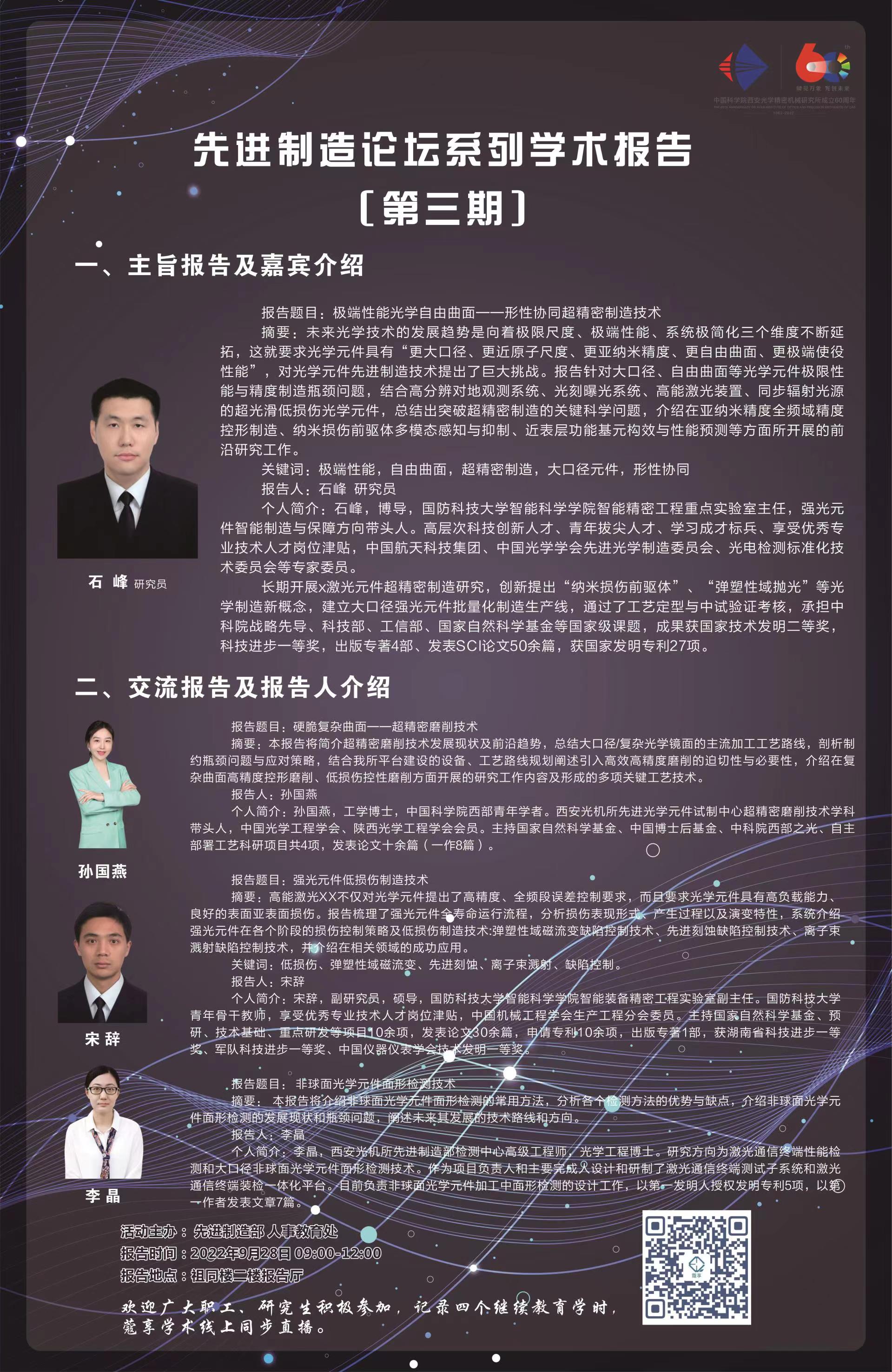 摘要:未来光学技术的发展趋势是向着极限尺度、极端性能、系统极简化三个维度不断延拓,这就要求光学元件具有“更大口径、更近原子尺度、更亚纳米精度、更自由曲面、更极端使役性能”,对光学元件先进制造技术提出了巨大挑战。报告针对大口径、自由曲面等光学元件极限性能与精度制造瓶颈问题,结合高分辨对地观测系统、光刻曝光系统、高能激光装置、同步辐射光源的超光滑低损伤光学元件,总结出突破超精密制造的关键科学问题,介绍在亚纳米精度全频域精度控形制造、纳米损伤前驱体多模态感知与抑制、近表层功能基元构效与性能预测等方面所开展的前沿研究工作。