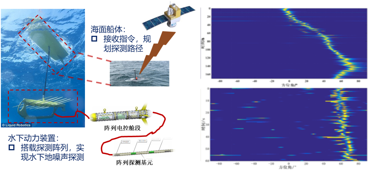 所研制拖曳式超细光纤水听器阵列通过感知水声信号引起的光纤相位变化实现对水声信号的探测,相比压电水听器,光纤水听器不仅灵敏度更高、抗电磁干扰能力更强,同时整个水听器工作段无需供电,极易用于构建小型水下无人潜器拖曳使用的水声探测阵列,能够有效降低水听器阵列对潜器能源的需求,提高潜器的续航能力。基于所研制的超细拖曳式光纤阵列,构建了波浪滑翔机用拖曳式超细光纤水听器阵列,已于2021年完成海上演示验证,可实现对噪声目标运动方位的估计,最大探测距离优于2km,定位精度优于5°。