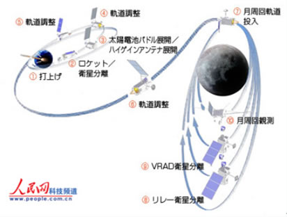 据该网站介绍,“月亮女神”卫星发射升空后,会先绕地球两圈,然后向月球飞去并进入绕月轨道。在两个子卫星分离后,主卫星会在距离月球100公里处的椭圆轨道上进行绕月飞行,进行大约一年的月球观测。而分离的两个子卫星也将在各自的椭圆轨道上飞行并进行月球观测。 |