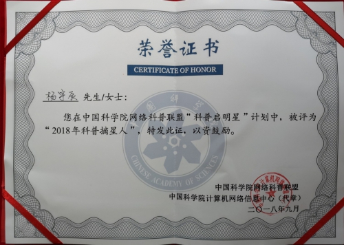 科管部杨宇辰获院网络科普联盟“科普摘星人”称号