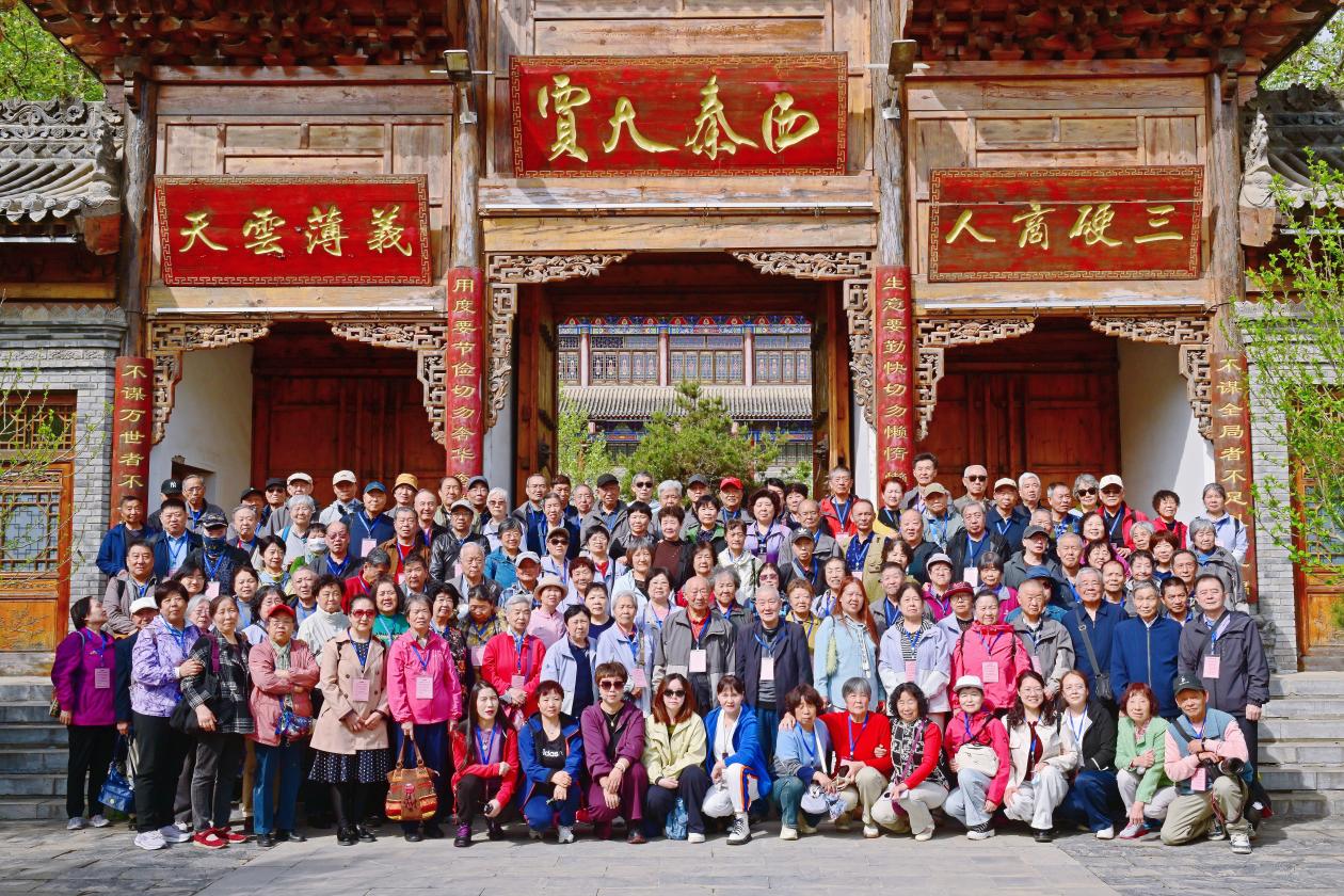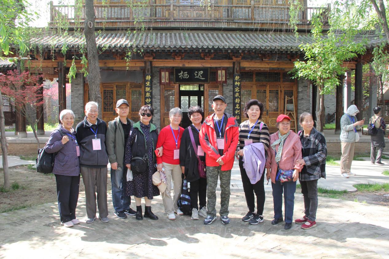 渭南桃花源影视基地坐落于临渭区三张镇,以明清风格关中古建筑为特色,园区内亭台楼阁错落有致,四合院古朴典雅,古塔、古街、戏楼相映成趣,兼具生态美景与人文底蕴。春日里,基地内草木葱郁、繁花盛开,老同志们漫步在青砖古道上,欣赏着雄浑大气的古建群落,感受着垂柳飘絮的清新风光,不时驻足拍照留念,记录美好瞬间。