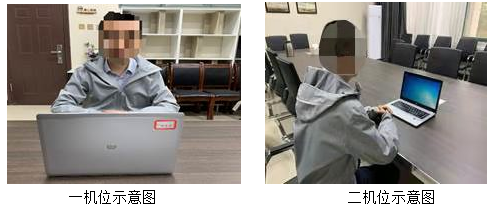 笔记本电脑(一机位)从正面拍摄,放置在距离本人30cm左右处,手机(二机位)从考生侧后方45°距离本人30cm左右处拍摄,确保一机位和二机位分别从考生面前和身后完整拍摄到考生全身,复试小组能够从二机位清晰看到一机位屏幕。效果图如下。
