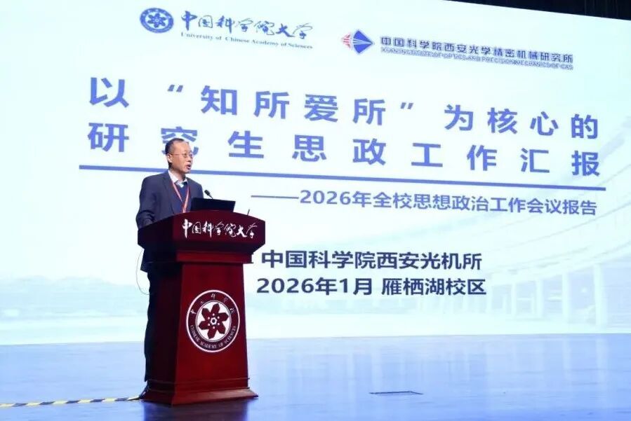 1月27日,中国科学院大学2026年思想政治工作会议在北京雁栖湖校区礼堂召开,中国科学院西安光机所副所长(法定代表人)邵晓鹏受邀参加并作《以“知所爱所”为核心的研究生思政工作》的专题报告。
